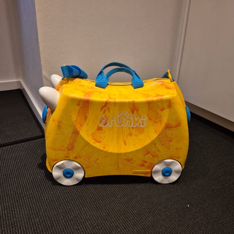 Fin kuffert/trolley med hjul til barn. Mine drenge er vokset fra den, så nu skal den med et andet barn på nye rejser.