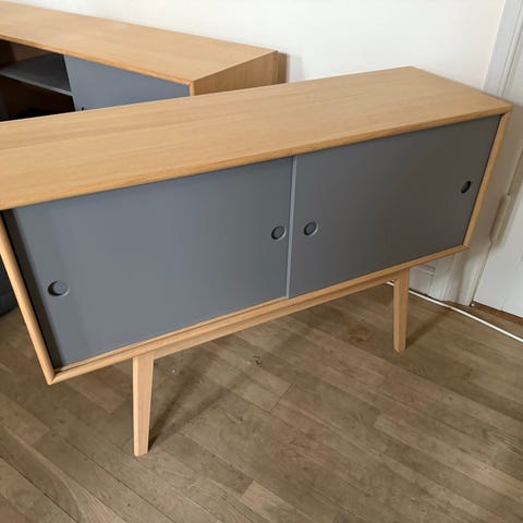 FDB A85 Skænk + 1 skuffe med grå låger og hylder. Brugt som tv møbel og derfor huller til ledninger på bagside.