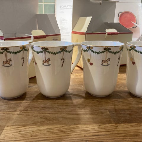 Royal Copenhagen nissekopper og skåle med motiv af nissefigurer. Sættet består af to kopper og to skåle med dekorativ kant og detaljerede illustrationer. Fremstillet i porcelæn.