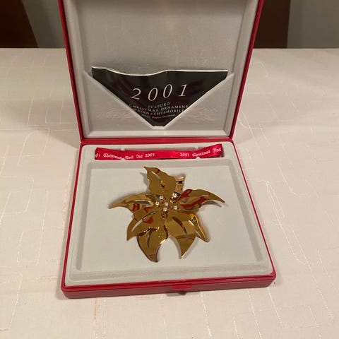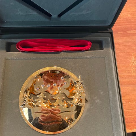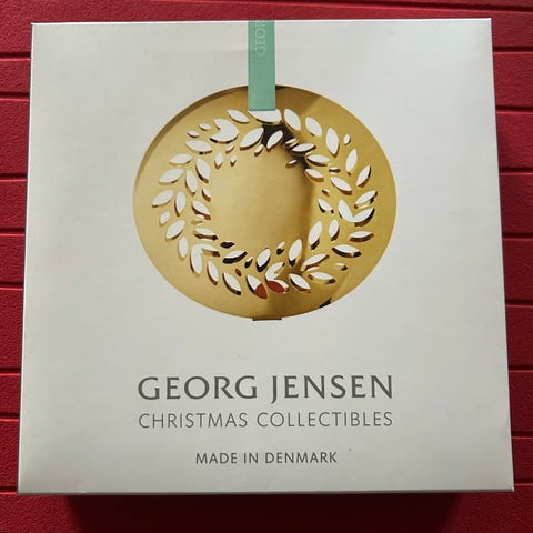 Georg Jensen Christmas Collection Juleuro 2016 i guldfarvet metal med rødt og grønt bånd.