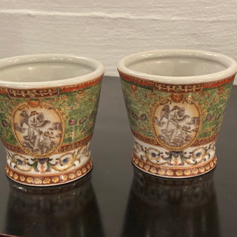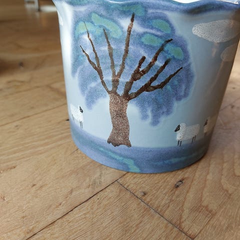 Keramisk vase med brun glasur og rund form. Potten har en bred kant og en naturlig, rustik finish. Velegnet til blomster eller som dekorativ genstand.