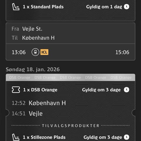 DSB Orange togbillet fra København H til Vejle St., gyldig i 4 dage, afgang kl. 05:52, ankomst kl. 07:53. Inkluderer 1 standard sæde.