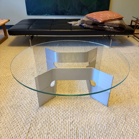 Stel i hvid emalje med gyldne detaljer og rund glasplade. Et dekorativt og elegant statement møbel, der passer perfekt i både moderne og klassiske hjem.