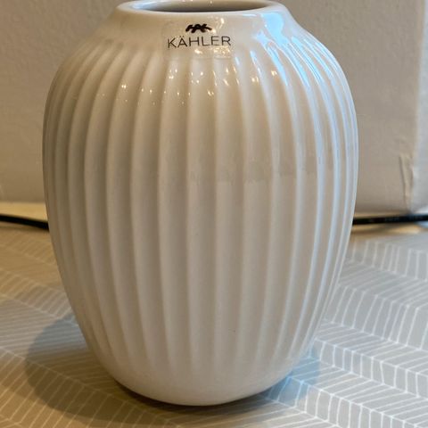 Vasen har en rund form med en smal hals og dekorative lodrette streger.