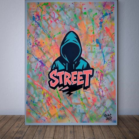 Spraymaling, akryl og Posca – afsluttet med to lag beskyttende lak.