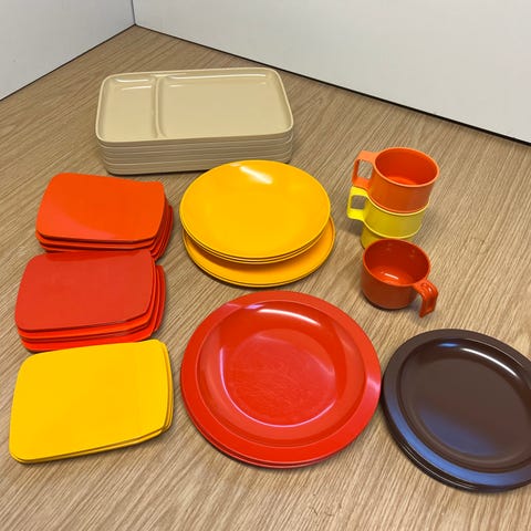 4 retro plastkander i orange, rød og turkis fra Tupperware, Rosti Mepal mfl. Sælges kun samlet.