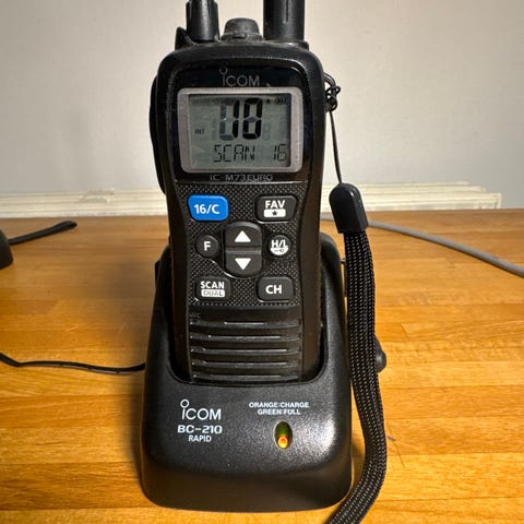 Icom IC-M72 international model. VHF med opladningsstation. Enheden er sort og designet til håndholdt brug. Radioen har flere funktioner til kommunikation og kommer med en base til opladning.
