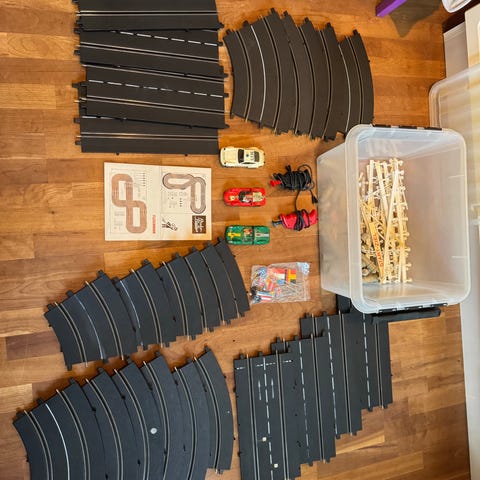 Stor 4 sporet racerbane projekt. Bane m. tilbehør. ingen biler. Måler: 160 x 240 cm.