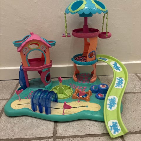 Koster 35 kr Littlest Pet Shop legetøj med forskellige farverige elementer og bevægelige dele, designet til børn. Legetøjet indeholder runde og spiralformede komponenter i farverne pink, orange og gul.