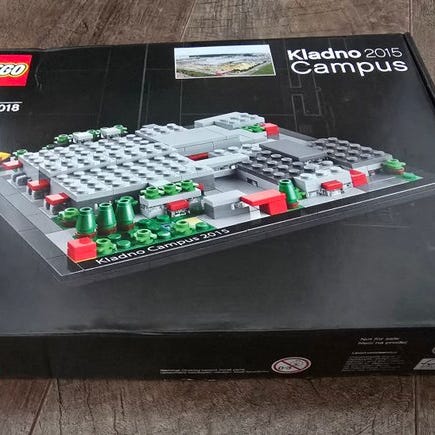 LEGO Kladno 2015 Campus model af et campusområde med detaljeret landskab og bygninger. Modellen er lavet af plastikklodser og egnet til samling og udstilling.