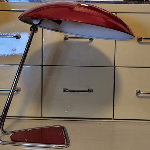 Original Bauhaus-lampe designet af Christian Dell i 1936 og produceret af Kaiser i Tyskland. Original emalje, ny ledning. Fremstår i utrolig flot stand, også på undersiden af skærmen. 2 stk. haves. Prisen er pr. stk.