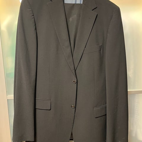 Sort BOSS jakkesæt i klassisk stil med jakke og bukser. Størrelse L / 102. God pasform og komfort. Dyb sort farve, velegnet til både arbejde og fest.