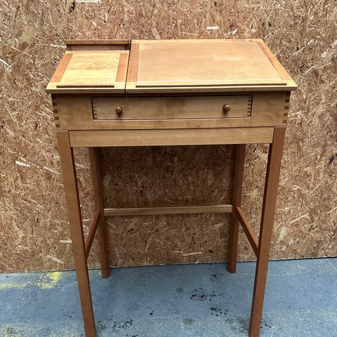 Skrivepult med sort læder, træsort kirsebær, indvendig rum og skuffe.