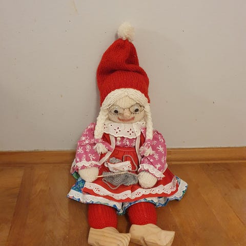 Nissemor med strikket krop. Rigtig træsko og forklæder af stof. 58 cm lang.