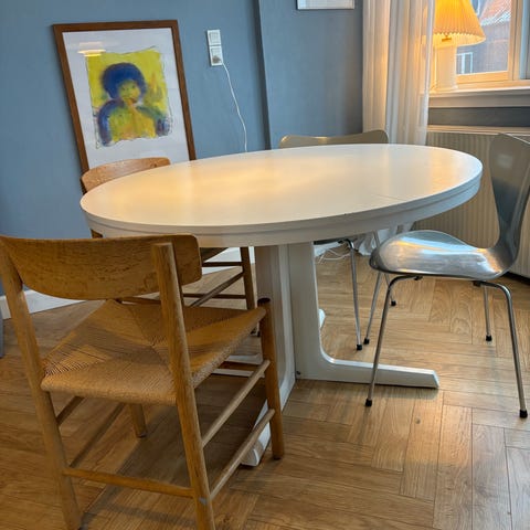 Farstrup. Lækker retro rundt spisebord i røget eg med udtræk, t0 tillægsplader. H. 73 cm. Tillægsplader 50 cm. Spisebord med plader totallængde 220 cm. Fremstår i pæn stand. Evt kan lev aftales
