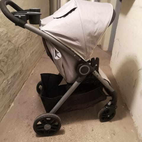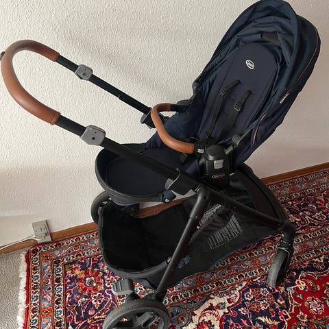 Graco klapvogn med barnevogn og Klapvognen, har justerbart håndtag med brun polstring og stor kaleche i lys grå farve. Alle dele er designet til at give komfort og sikkerhed til barnet.