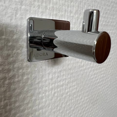 Kromet metal krog med vægbeslag til montering. Designet til at hænge genstande på væggen, velegnet til forskellige rum i hjemmet eller kontoret.