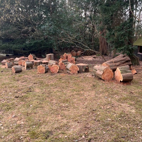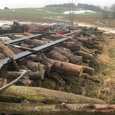 Brændestak af opskæret gran i håndterbare stykker længder. Fra efteråret 23, tørt og klar til at blive flækket og brugt.
