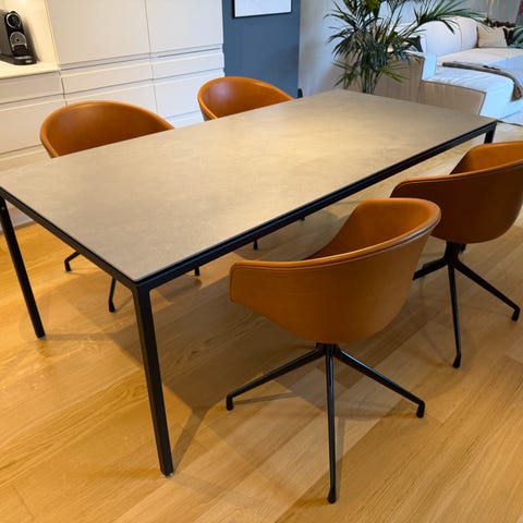 Smukt og elegant spisebord fra danske Vipp. Det æstetiske bord har en rektangulær form og en base af stål med en bordplade af stentøj. Basens stål og bordpladens delikate rundede kanter, er fremstillet til at modstå tidens test - både i funktion og æstetik. Dette gør bordet optimalt til brug i stuen eller køkkenet, hvor det kan stå som en smuk detalje i indretningen i mange år.