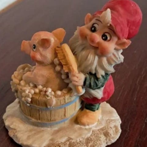 Nissen er stor 26 cm høj og i gips, den sælges med løs gips paddehat ca. 8 cm høj og lysestagen forrest. Samlet pris