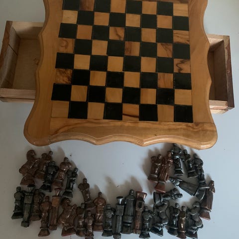 Et stort skakspil som er i sort , hvid og grøn Onyx , er fra 1970 erne’ , købt i Mexico , har nogle små, skavanker ( se billeder) ellers i en super stand, mål på brættet 45 x 45 cm , Søgeord ! Samler, indbo, spil , leg, dekoration, Deco, pynt, SENDER IKKE , KAN EVT LEVERES ELLER AFHENTNING .