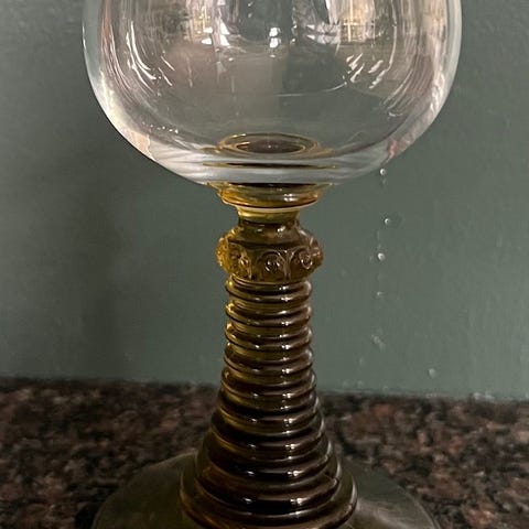 Vinglasset er lavet af gennemsigtigt glas med en akvamarinfarvet snoet fod.