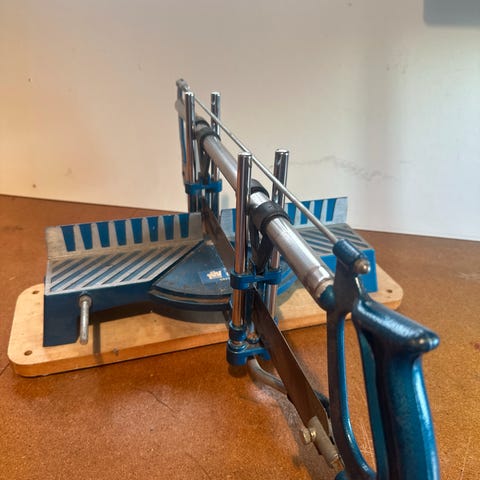 Brugt og lidt rusten, men med ny klinge virker den fint.