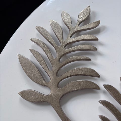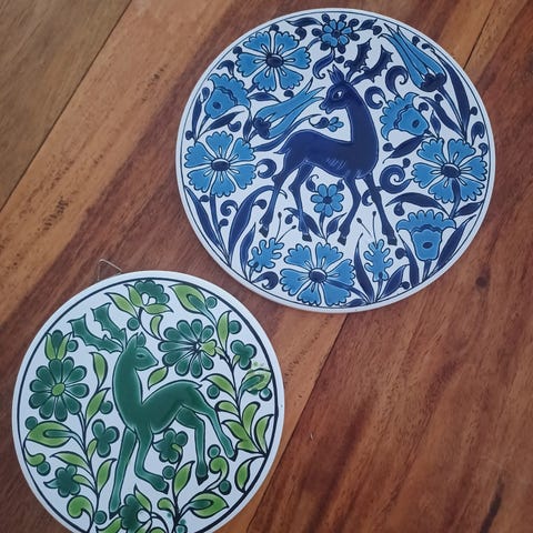 Dekorationsplader med blå og hvide mønstre. Brugt som bordskånere.