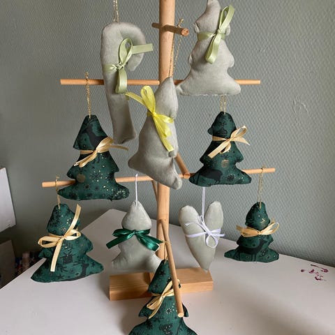Julepynt i form af en hæklet gris. Fremstillet i pink garn med rødt bånd som pynt. Velegnet til juletræet som en dekorativ ornament til jul.