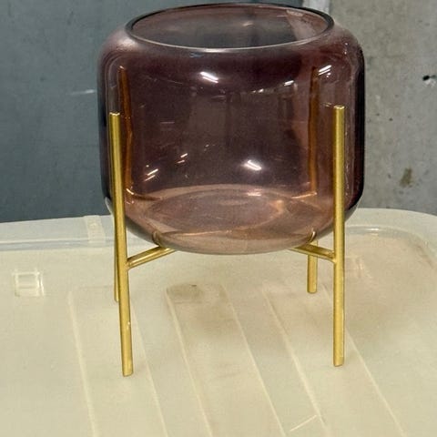 glasvase med sort metalstativ. Vasen er lavet af glas og står i en sort metalramme, der fungerer som støtte. Velegnet til dekoration med tørrede eller friske blomster.