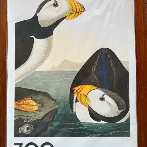 Plakat med motiv af pingviner, titlen 'For the Zoo Book Regent Park or Camden Town'. Indrammet med sort ramme og beskyttende hjørner. Farverne er overvejende orange og sort med røde og gule detaljer.