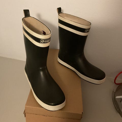 gummistøvler i størrelse 22, unisex design. Støvlerne har et mønster med grønne og mørke farver og er velegnede til børn.