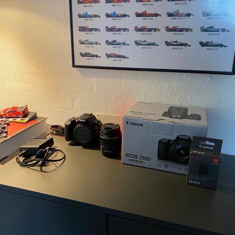 Canon 250D kamera med udskifteligt objektiv. Kameraet har en drejelig skærm, der gør det muligt at tage billeder fra forskellige vinkler. Kameraets farve er sort, og det er designet til fotografering med høj billedkvalitet.