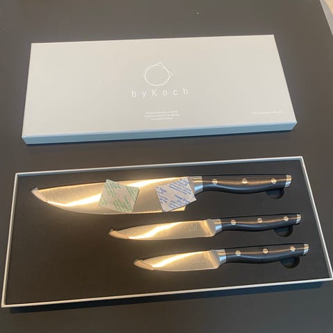 Lækkert knivsæt fra byKoch,I samarbejde med den anerkendte kok, Jesper Koch, kan præsentere dette professionelle knivsæt. Jesper Koch er blandt andet kendt for fjernsynsprogrammerne Masterchef og Koch´en på toppen og har gennem tiden været leder og ejer af et utal hoteller og restauranter i ind- og udland. Dette funktionelle knivsæt indeholder 3 knive: køkkenkniv, grøntsagskniv og urtekniv.er en kombination af klassiske med Japanske tradition i høj kvalitet, Ideal som julegave, knive kommer i en fint æske med tekst bag i. kan hentes for 300 kr. sendes gerne privat.