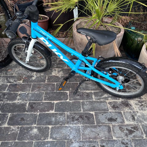 Puky børnecykel med 16 tommer hjul i blå farve. Cyklen er designet til børn og har en robust ramme samt bagagebærer. Den har pedaler og et komfortabelt sæde.