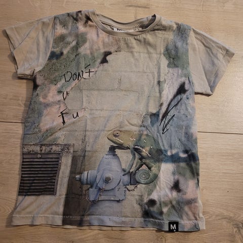Molo langærmet T-shirt i størrelse 104 til drenge. T-shirten er grå og fremstillet af bomuld. Den har et mønster med tigre på fronten og grå ærmer.