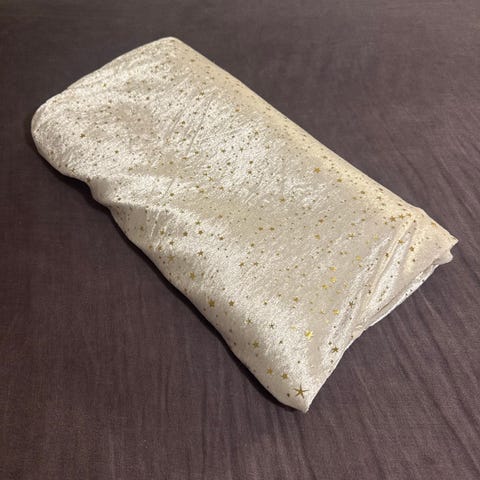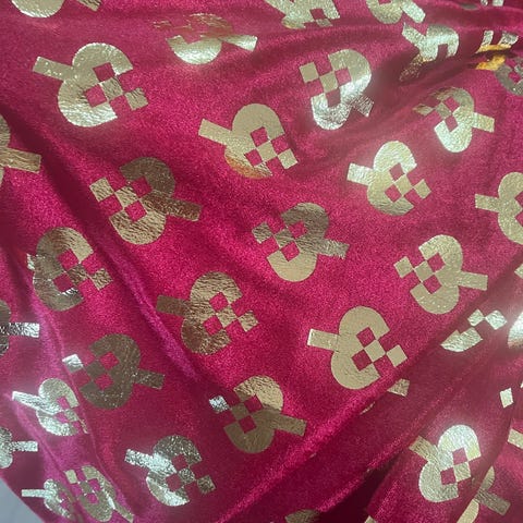 Stor rød bomuldsdug med trykt julemotiv i guld eller sølv..