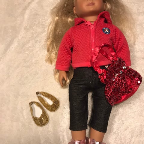 Fin Our Generation dukke med frakke, tøj, støvler, skøjter og taske - 100 kr.