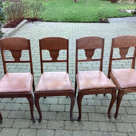 Tre træstole med læderbetræk Sælges også enkeltvis.Prisen for tre tilsammen er firs kroner.