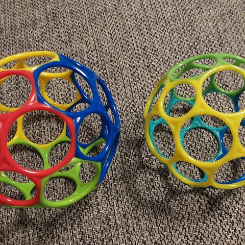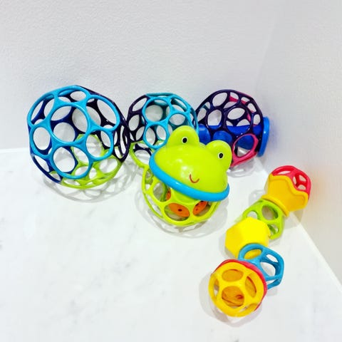 Oball legetøj designet til børn. Fremstillet i plastik med farverne grøn, gul, orange og blå. Legetøjet har forskellige teksturer og huller, der kan stimulere børns sanser og motoriske færdigheder.