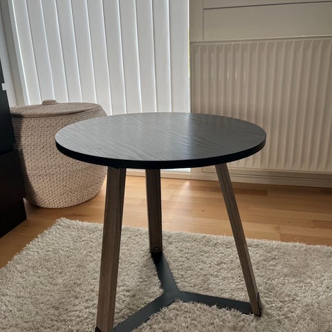 Møblet er et ovalt sidebord med en skuffe og en keramisk skål under. Det er lavet af træ med en lys farve.,Afhentes i:,Røde Kors Kolding (621),Bemærk at mail, chat og beskeder ikke besvares, og varen skal købes på knappen "Gå til varen"