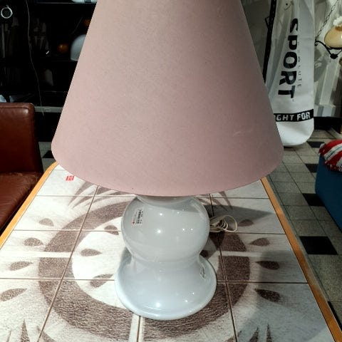 Lampe med stand af klart glas med facet slebet mønster. Den har en fast skærm af hvid plast. Der er afbryder på ledningen.,Afhentes i:,Røde Kors Tuborgvej / København NV (101),Bemærk at mail, chat og beskeder ikke besvares, og varen skal købes på knappen "Gå til varen"