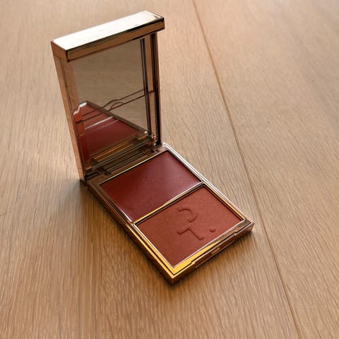 Patrick Ta Double Take Creme & Powder Blush med kombination af creme og pudderformel. Produktet leveres i en kompakt æske med spejl, designet til nem påføring og bærbarhed.