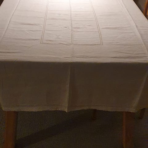 Ældre dansk håndbroderet hørdug med hæklet kant. Dugen er nøje gennemgået, vasket og strøget. Dugen er i meget fin stand.