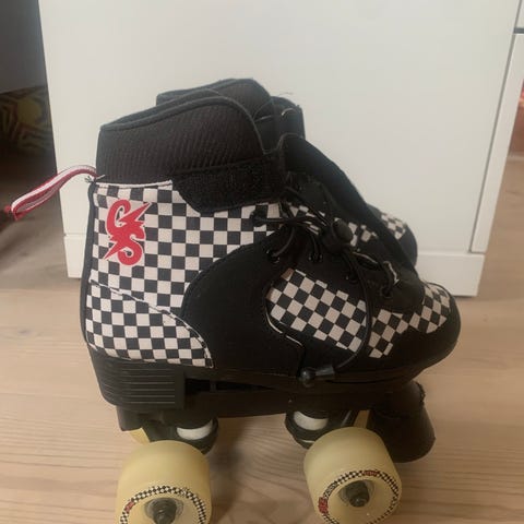 Circle Society rulleskøjter til børn i størrelse 29-34. Rulleskøjterne har en hvid og lyserød farve og er designet til rulleskøjteløb. Den ene ‘flap’ skal lige sys fast