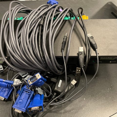 Aten KVM-switch, model CS64U, der gør det muligt at styre flere computere fra én konsol (tastatur, skærm og mus). Switchen har flere porte og kommer med tilhørende kabler inklusiv USB og VGA, som er nødvendige for forbindelserne. Enheden har fire knapper foran til skift mellem de tilsluttede computere. Bagsiden har forskellige porte til konsol og computere. Mål for enheden er 21x9 cm.