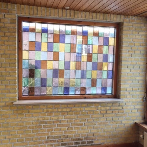 Farvet glasvindue med dekorative mønstre i gult, grønt og lilla. Vinduesdesignet indeholder geometriske figurer og cirkler, som skaber et unikt og farverigt udtryk. Velegnet til at tilføre æstetik og farve til indendørs rum.