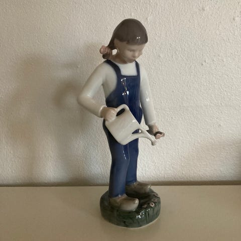 Bing og Grøndahl figur af en pige iført blå overalls og hvid bluse, holdende en hvid vandkande. Figuren er lavet i porcelæn og viser en detaljeret og malet design.