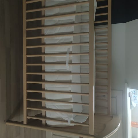 Denne er junior udgave, men den kan laves til mini med madras. Da den har lidt slidmærker og mangler det ene hul kommer det hele til en billig pris.