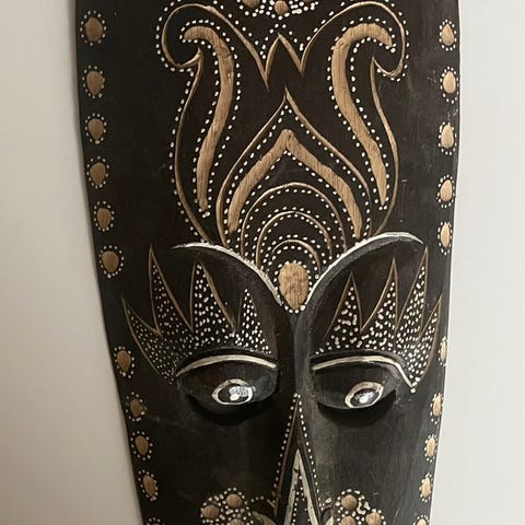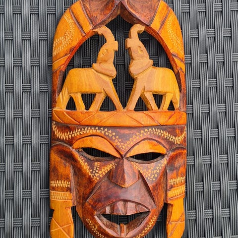 Vintage håndlavet afrikansk maske med djævel eller dæmon til ophæng til væggen. Hjembragt i 80’erne.